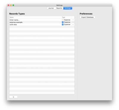 Step 2: Add the name of the expenses and income you want to use in your application. Check "Expense" check box if the record type is an expense. If you uncheck this check box you'll have an income.